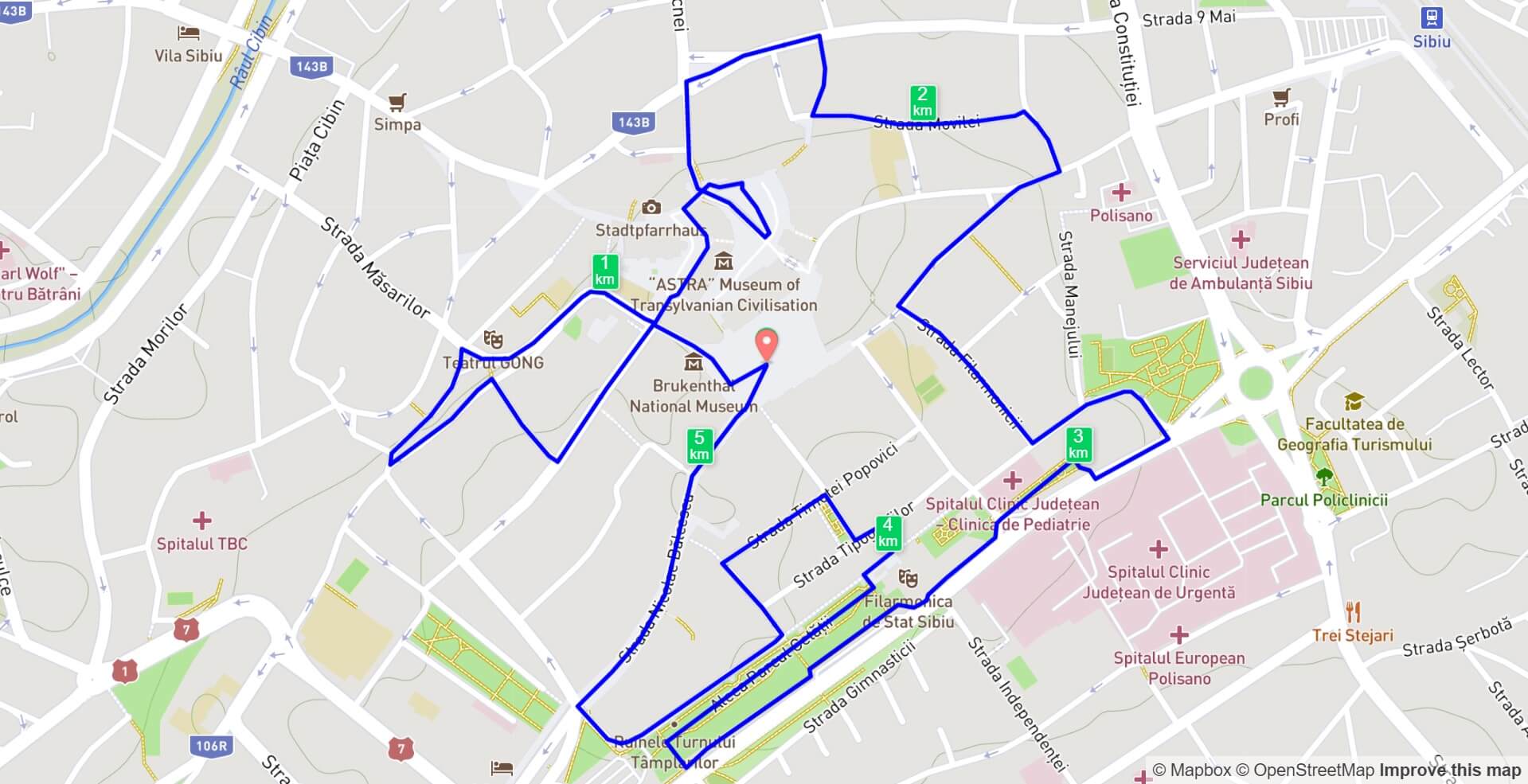 START: Piața Mare – Muzeul Samuel von Brukenthal – Mitropoliei – Poștei – Centumvirilor – Konrad Hass – Alexandru Odobescu – P-ța Huet – Podul Minciunilor – P-ța Mica – Ocnei – P-ța Dragoner – 9 Mai – Târgului – Movilei – Felinarului – Magheru – Filarmonicii – Pompiliu Onofrei – Coposu – Coposu pe sub Ziduri – Parcul Cetății – Cetății – Tipografilor – P-ţa Schiller – Timotei Popovici – Papiu Ilarian – Cetăţii – Bălcescu- Piața Mare – FINISH CROS