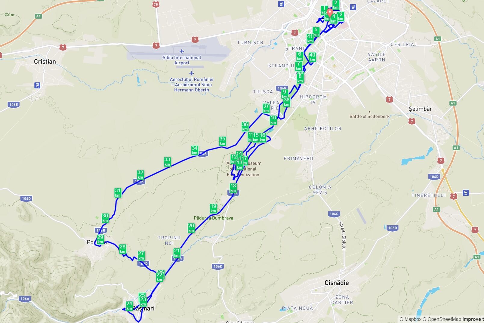 START: Piața Mare – Muzeul Samuel von Brukenthal – Mitropoliei – Poștei – Centumvirilor – Konrad Hass – Alexandru Odobescu – P-ța Huet – Podul Minciunilor – P-ța Mica – Ocnei – P-ța Dragoner – 9 Mai – Târgului – Movilei – Felinarului – Magheru – Filarmonicii – Pompiliu Onofrei – Coposu – Coposu pe sub Ziduri – Parcul Cetății – Cetății – Tipografilor – P-ţa Schiller – Timotei Popovici – Papiu Ilarian – Cetăţii – Victoriei – Martin Hochmeister – Luarea Bastiliei – Parcul Sub Arini – Zoo – Muzeu – Zoo – Rășinari (DJ 106A)- Poplaca (DJ 106D) – Sibiu (DJ 106R) str. Valea Aurie – Aleea Călăreților – Parcul Sub Arini – Stadionul Municipal (tură) – Parcul Sub Arini – Victoriei – Bălcescu – Piața Mare – FINISH MARATON