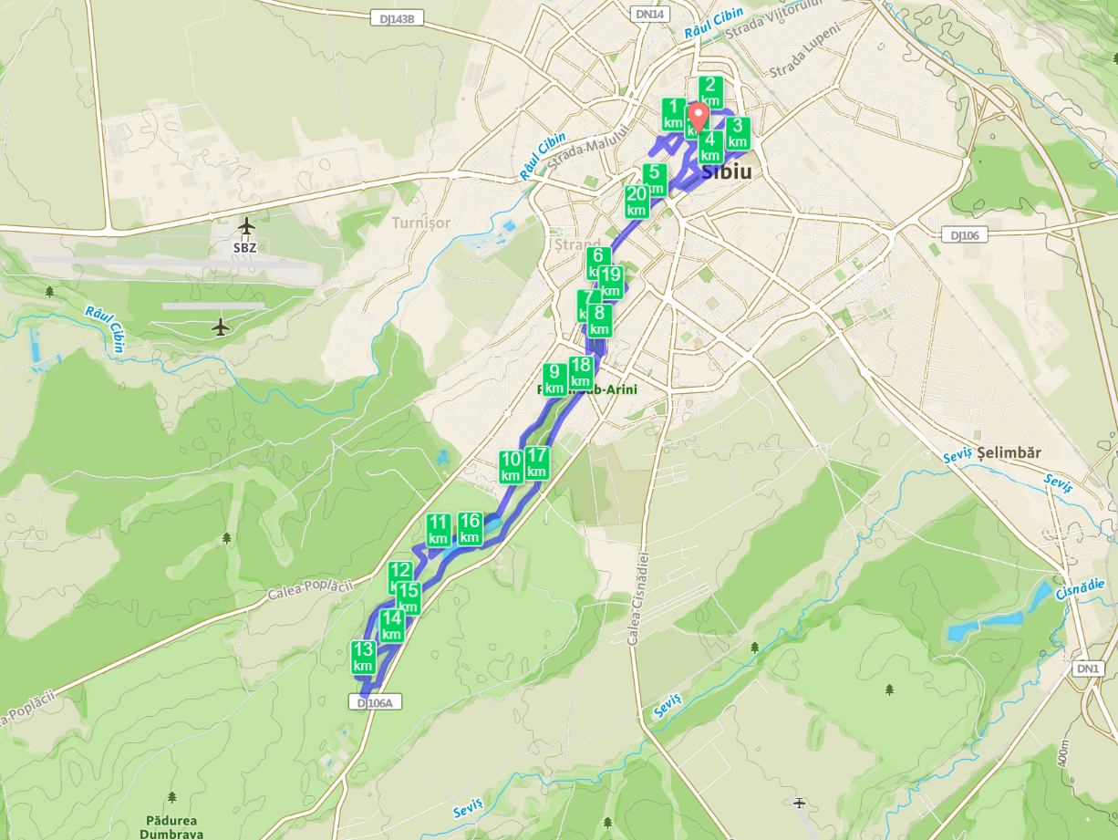 START: Piața Mare – Muzeul Samuel von Brukenthal – Mitropoliei – Poștei – Centumvirilor – Konrad Hass – Alexandru Odobescu – P-ța Huet – Podul Minciunilor – P-ța Mica – Ocnei – P-ța Dragoner – 9 Mai – Târgului – Movilei – Felinarului – Magheru – Filarmonicii – Pompiliu Onofrei – Coposu – Coposu pe sub Ziduri – Parcul Cetății – Cetății – Tipografilor – P-ţa Schiller – Timotei Popovici – Papiu Ilarian – Cetăţii – Pasaj Continental Forum – Victoriei – Martin Hochmaister – Luarea Bastiliei – Parcul Sub Arini – Zoo – Muzeu – Zoo – Aleea Călăreților – Parcul Sub Arini – Victoriei – Bălcescu – Piața Mare – FINISH