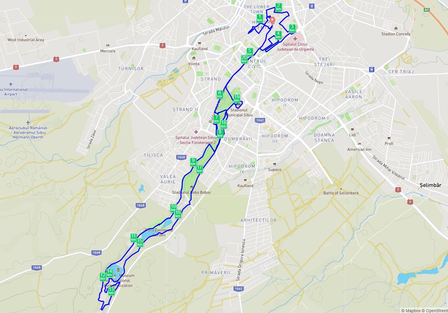 START: Piața Mare – Muzeul Samuel von Brukenthal – Mitropoliei – Poștei – Centumvirilor – Konrad Hass – Alexandru Odobescu – P-ța Huet – Podul Minciunilor – P-ța Mica – Ocnei – P-ța Dragoner – 9 Mai – Târgului – Movilei – Felinarului – Magheru – Filarmonicii – Pompiliu Onofrei – Coposu – Coposu pe sub Ziduri – Parcul Cetății – Cetății – Tipografilor – P-ţa Schiller – Timotei Popovici – Papiu Ilarian – Cetăţii – Victoriei – Martin Hochmaister – Luarea Bastiliei – Parcul Sub Arini – Zoo – Muzeu – Zoo – Aleea Călăreților – Parcul Sub Arini – Stadionul Municipal (tură) – Parcul Sub Arini – Victoriei – Bălcescu – Piața Mare – FINISH